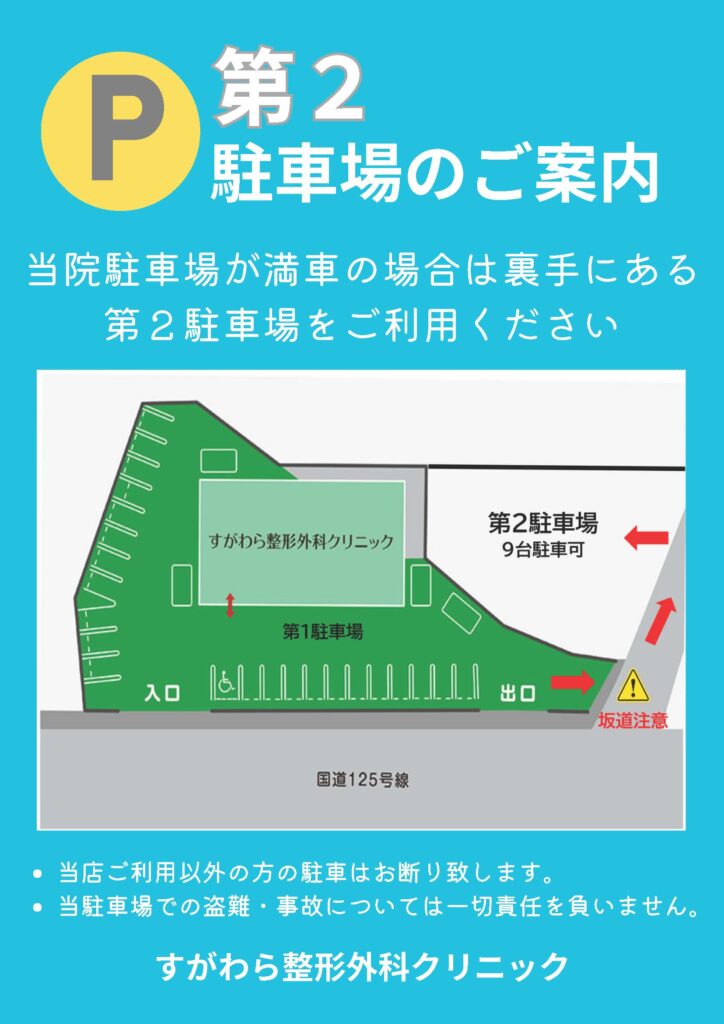 第2駐車場はクリニック裏手の坂の下に位置しており、当院までは上り坂となっております。足の痛みがある方や移動に不安がある方は、まずはクリニック敷地内の駐車場の空きをご確認いただき、無理のない範囲でご利用いただけますと幸いです。
